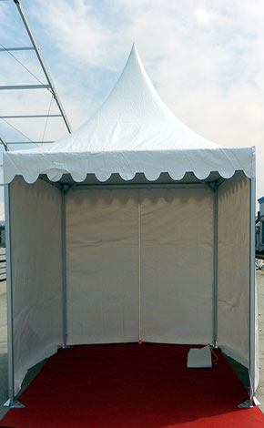 尖頂篷房系列尺寸有3×3米、4×4米,邊高是2.5米,采用二槽的48×84×2.5㎜鋁合金管材做支架。5×5米、6×6和10×10米的尖頂篷房標準邊高是2.5米,用四槽的48×105×3.5㎜鋁合金型材做支架,抗風速80公里/小時。