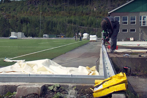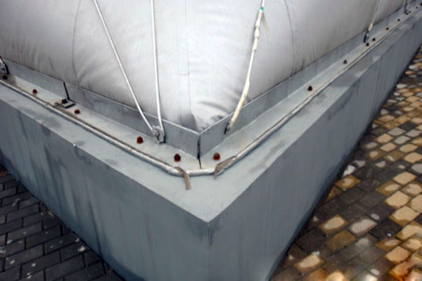 建筑膜體的下沿與基礎梁的連接,用專用的鋼質夾具壓邊,用鏍栓連接到基礎梁中預埋的錨桿上,再將鋼纜穩(wěn)定(應力控制)系統(tǒng)連接到錨桿上。