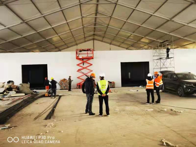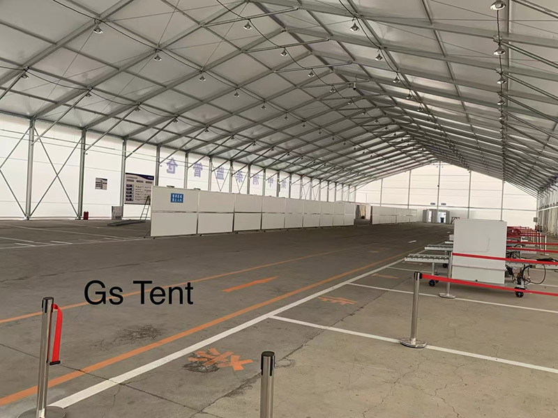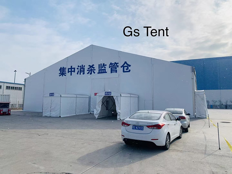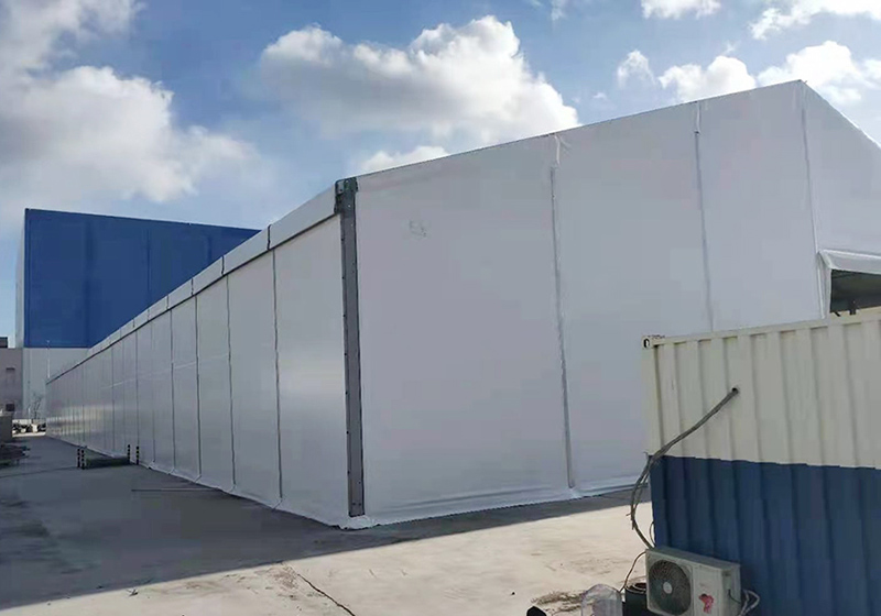 在本次大連冷鏈疫情中,高山篷房提供的2400平的裝配式物流倉儲篷房、22座推拉篷房和6座更衣室篷房已正式投入使用。在抗擊疫情這種緊急時(shí)刻,去臨時(shí)修建傳統(tǒng)固定倉庫,時(shí)間上是不允許的,因此搭建快速、結(jié)構(gòu)安全的裝配式篷房就派上了用場。