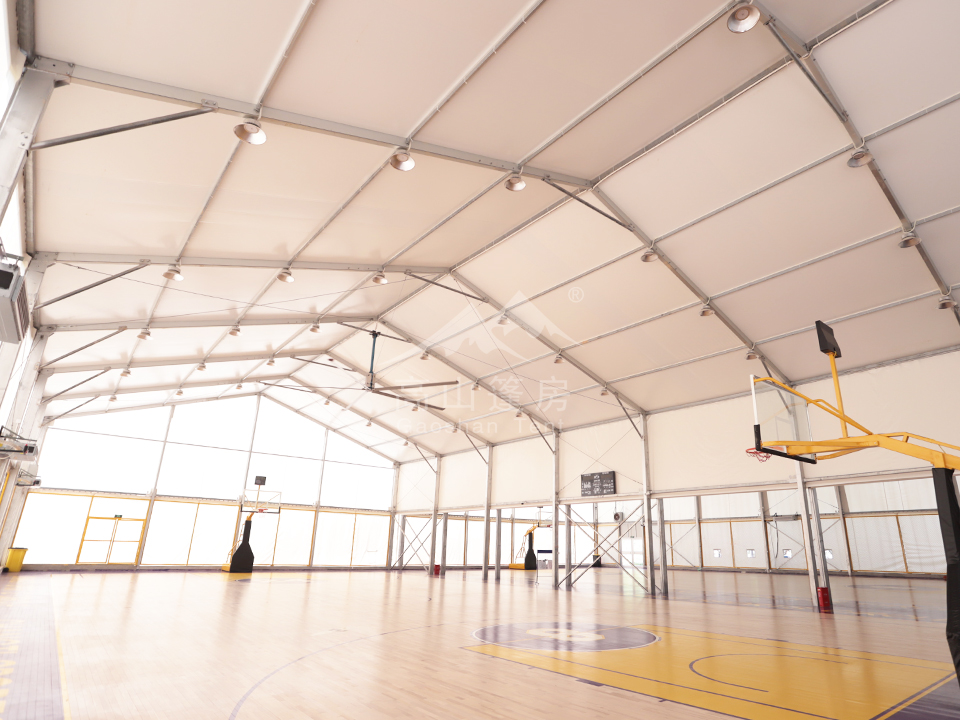 體育篷房采用模塊化設(shè)計(jì),跨度可達(dá)50米且內(nèi)部無(wú)立柱,完美適配籃球、羽毛球等對(duì)空間要求高的運(yùn)動(dòng)。通過(guò)配置專業(yè)地板、照明及通風(fēng)系統(tǒng),篷房可輕松切換為多功能場(chǎng)館——上午舉辦籃球賽,下午改造為羽毛球場(chǎng),晚上轉(zhuǎn)為文藝演出空間。其結(jié)構(gòu)具備極強(qiáng)的環(huán)境適應(yīng)性:鋁合金框架與PVC篷布可抵抗10級(jí)大風(fēng)及-30℃至50℃的極端溫度,結(jié)合雙層保溫層與智能通風(fēng)系統(tǒng),實(shí)現(xiàn)冬暖夏涼的舒適環(huán)境。