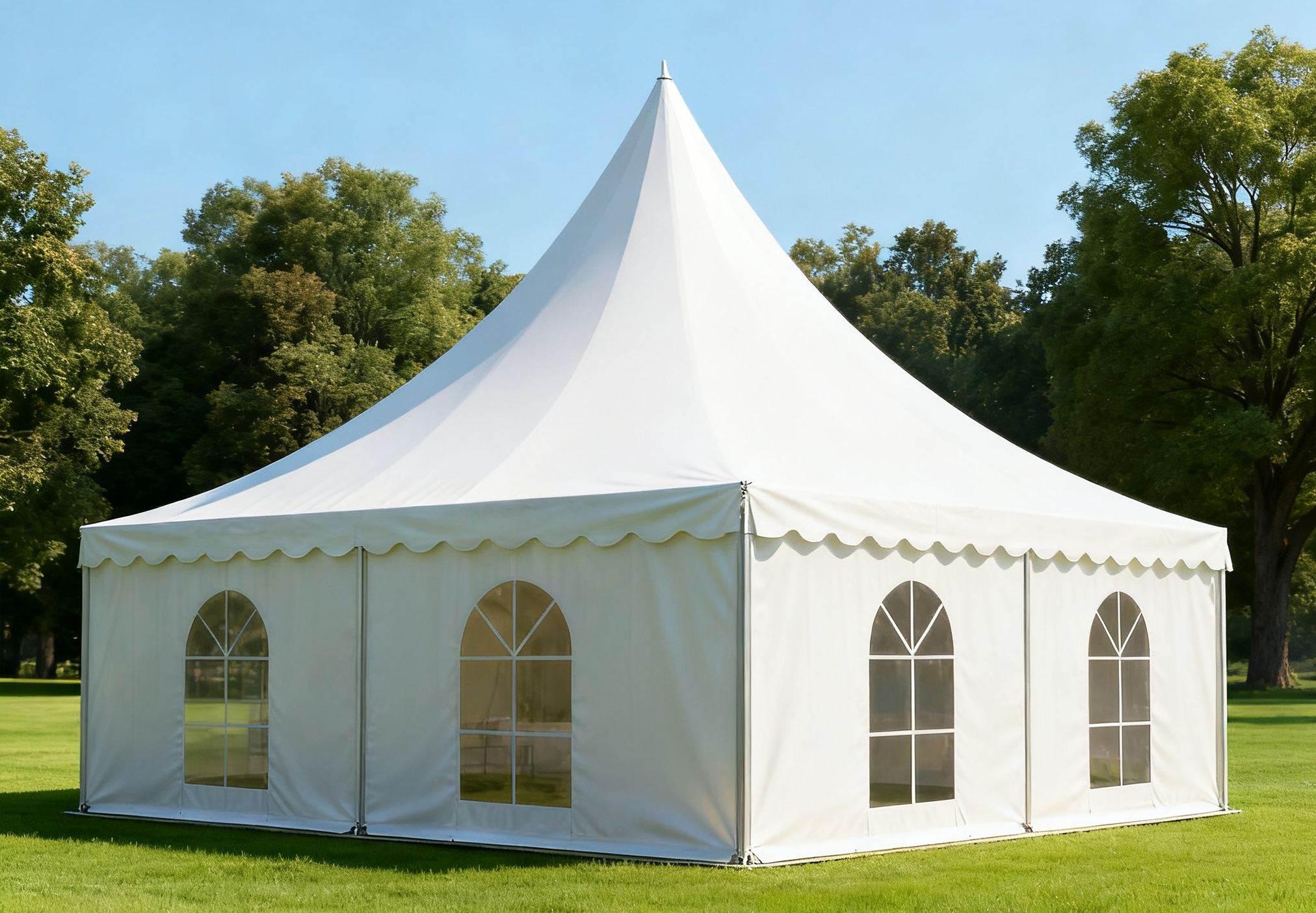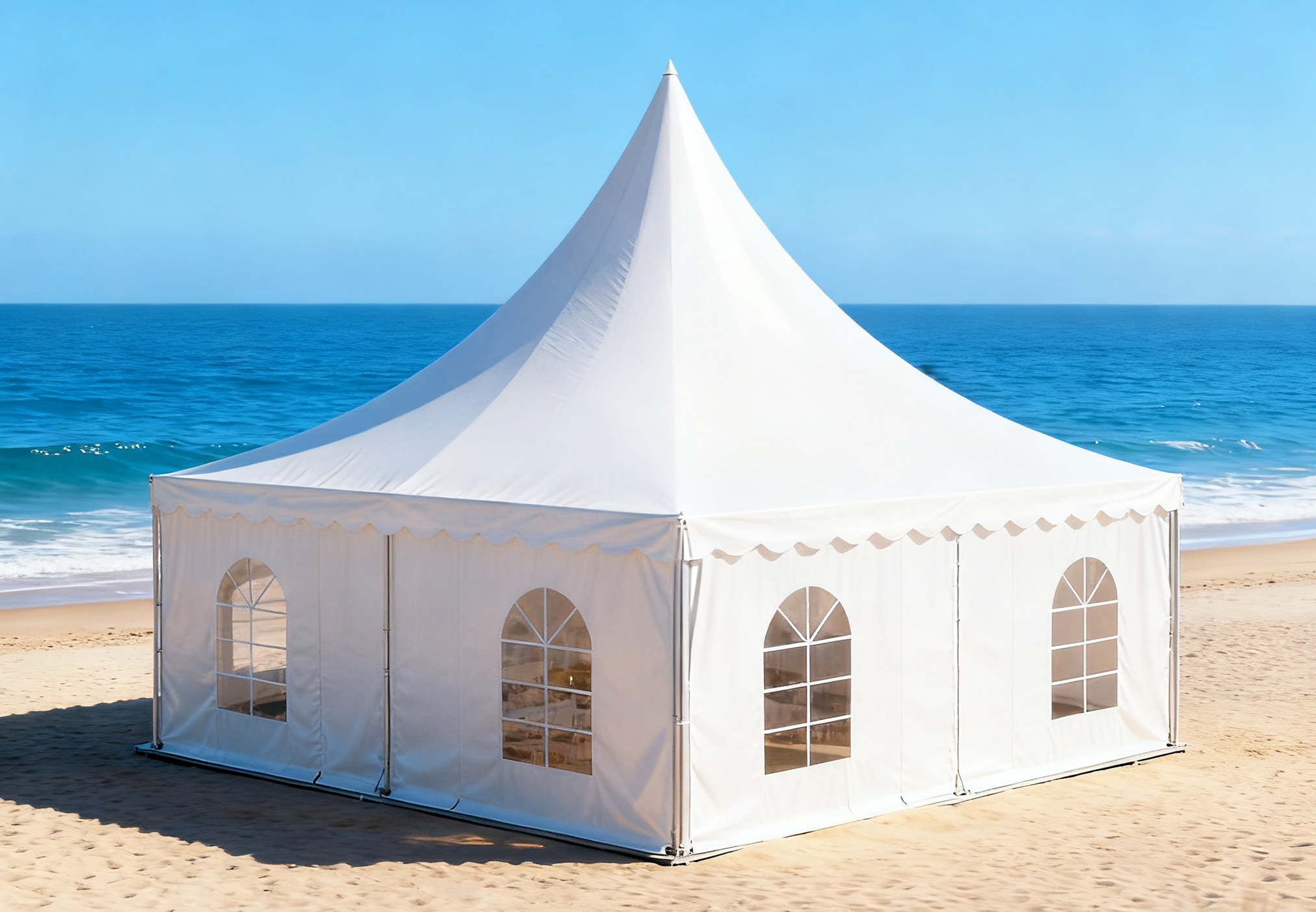 尖頂篷房,又稱寶塔帳篷或錐頂篷房,是一種專為戶外活動(dòng)設(shè)計(jì)的臨時(shí)建筑。它以獨(dú)特的尖頂造型打破了傳統(tǒng)篷房的單調(diào)輪廓,棱角分明的立體幾何結(jié)構(gòu)兼具現(xiàn)代藝術(shù)感與視覺(jué)沖擊力,為各類活動(dòng)增添獨(dú)特格調(diào)。