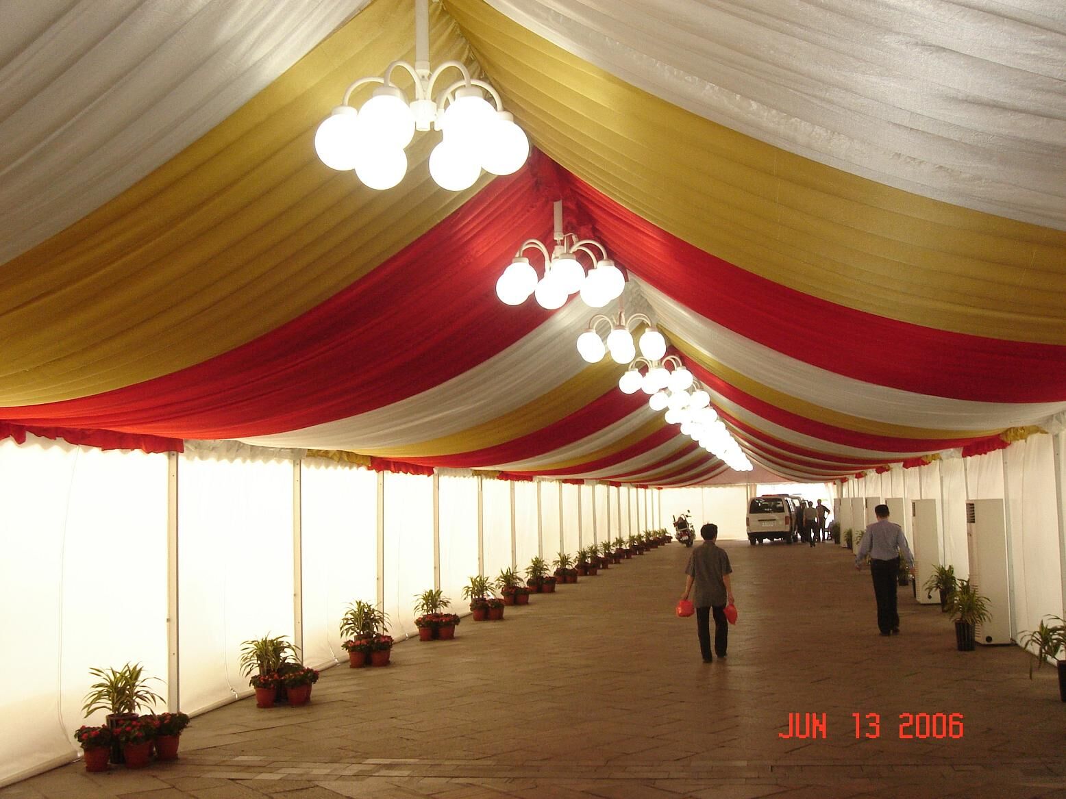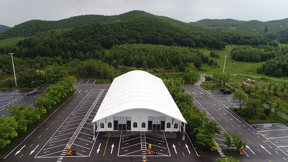 不同于常規(guī)的人字篷房,拱形篷房的篷頂結(jié)構(gòu)是經(jīng)過創(chuàng)新改良而成,利用鋁合金可塑性原理將頂部進(jìn)行壓彎,變成有一定弧度的拱形。