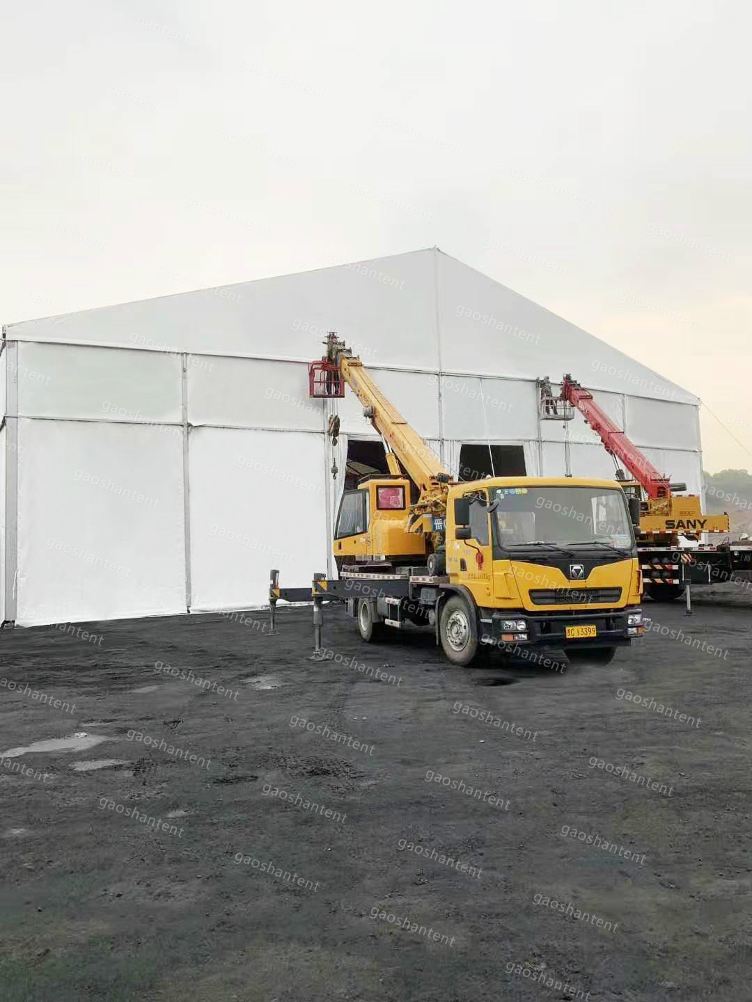 與傳統(tǒng)建筑相比,篷房本身屬于臨時建筑,無需繁復的審批手續(xù),高山利用客戶園區(qū)自由場地,建造跨度50m、頂高15m的全鋁合金倉儲中轉空間,隨著加工地點、環(huán)保要求的變化,靈活實現(xiàn)可移動,從容解決環(huán)保難題。